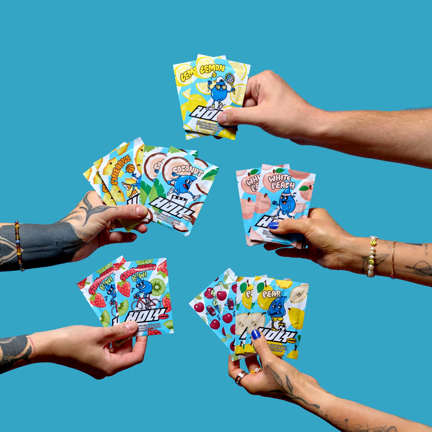 Tu cherches un rafraîchissement sain pour le sport, les journées chaudes ou les longues nuits de folie ? Alors teste nos sept délicieuses variétés hypotoniques HOLY Hydration® : Coconut, Lemon, Pear, Pineapple, Sour Cherry, Strawberry Kiwi & White Peach - et trouve ton parfum préféré ! Tu recevras deux échantillons par variété et un shaker à prix d'ami !