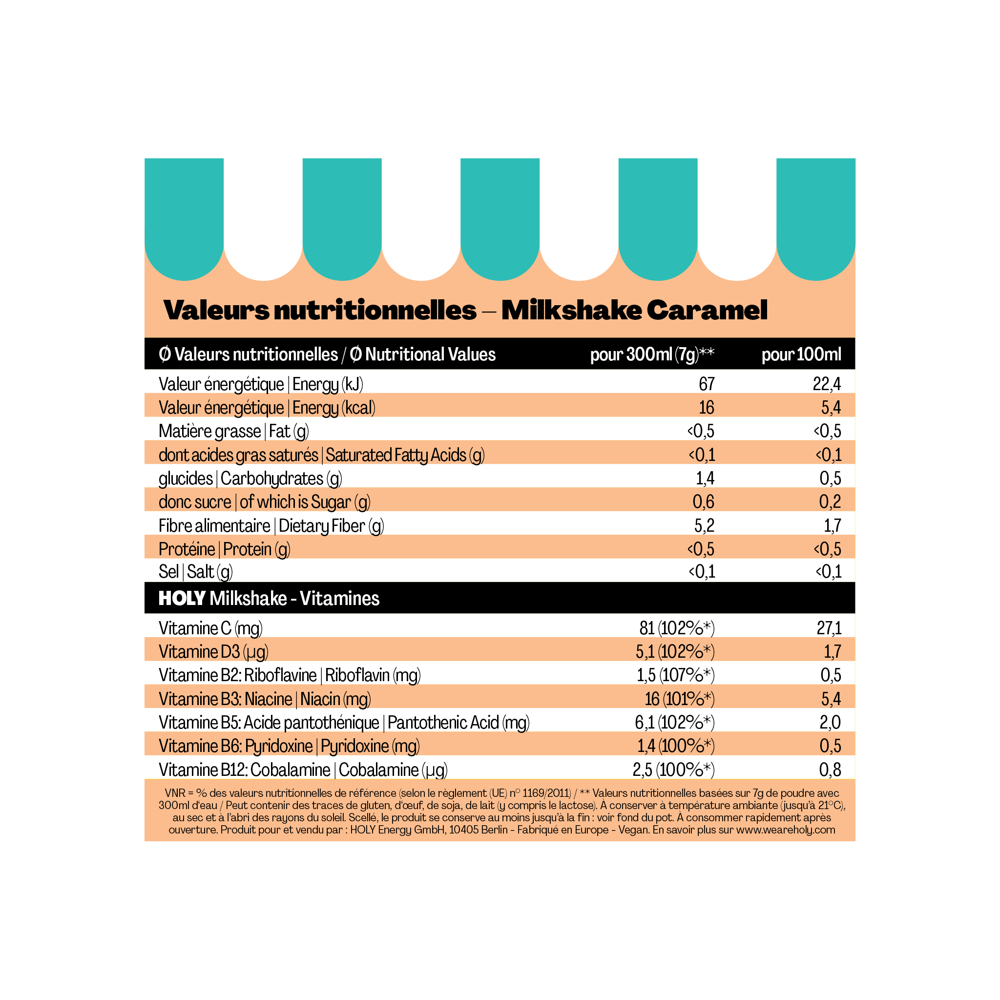 Des reflets d'or : offre-toi le nouveau HOLY Milkshake savoureux au caramel - le premier milkshake au goût qui claque et à la bonne conscience ! Pas de sucre, peu de calories, mais plein de vitamines. Il suffit de le mélanger avec le lait de ton choix et de le savourer !
