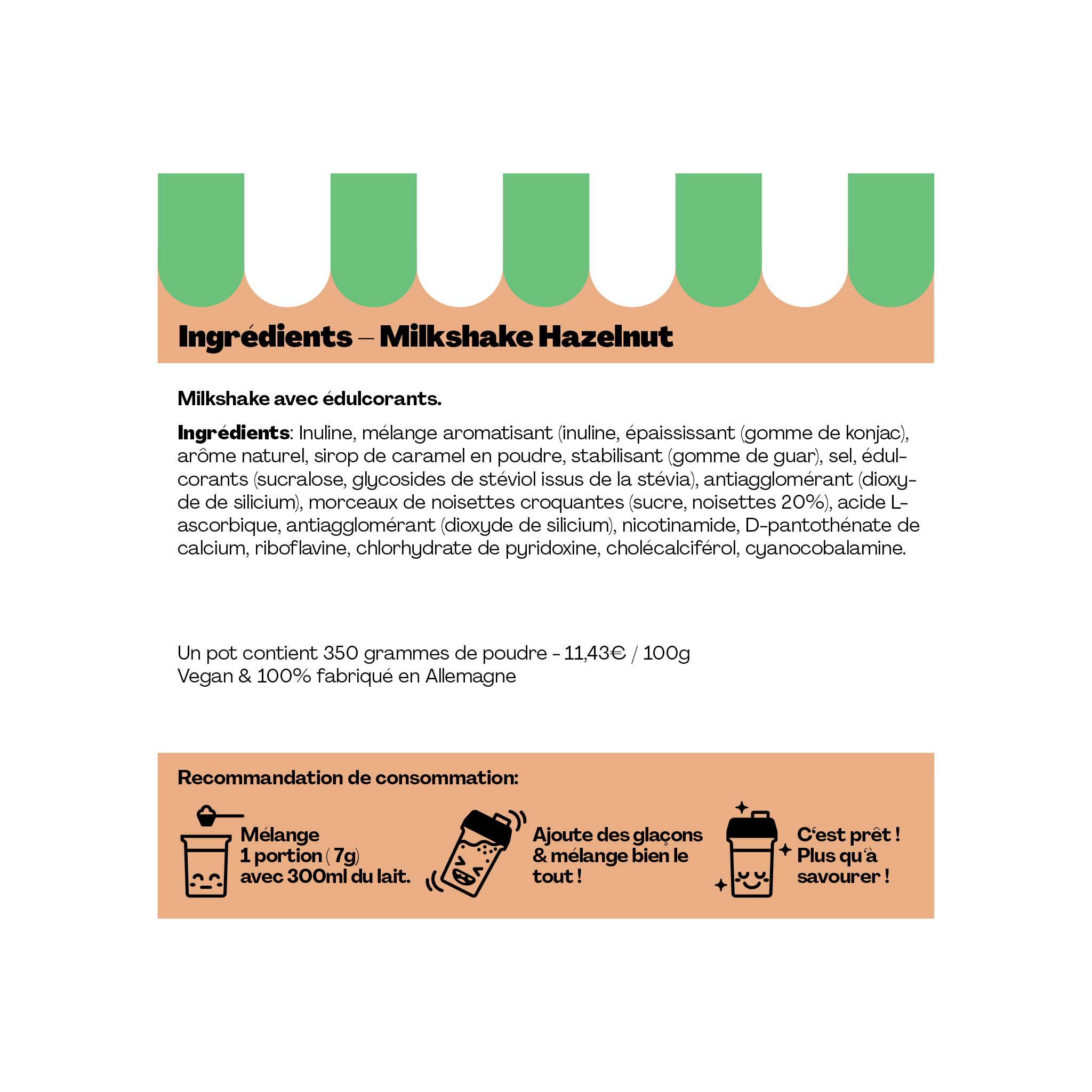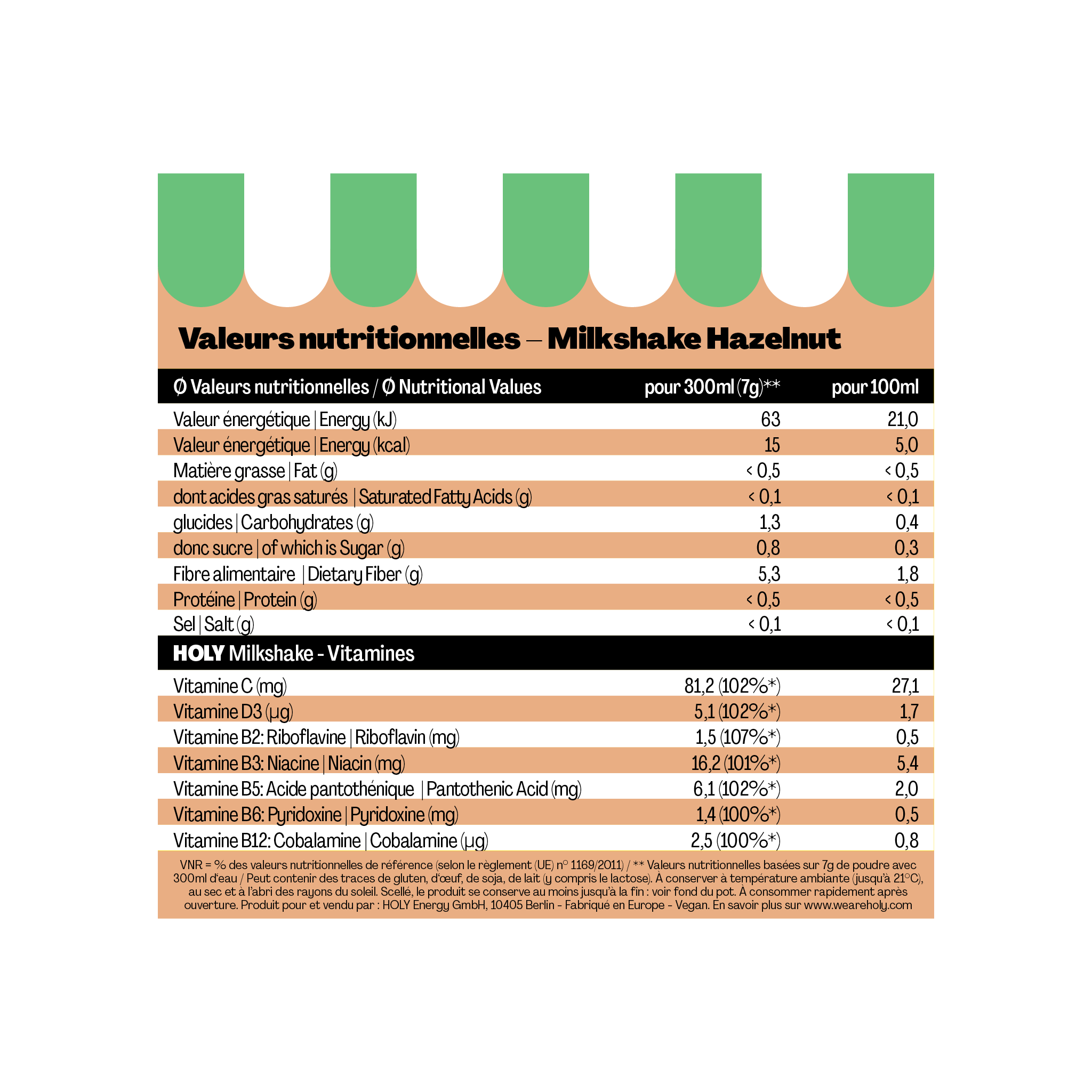 À fond les noisettes ! Découvre le nouveau milkshake HOLY à la noisette - le premier milkshake au goût onctueux et en toute bonne conscience ! Pas de sucre, peu de calories, mais plein de vitamines. Il suffit de le mélanger avec du lait & de le savourer !